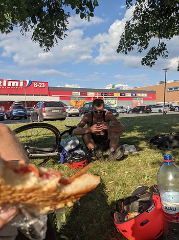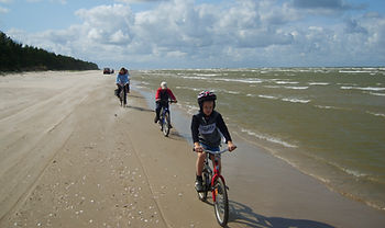Iestiprinājušies, saldējumus pārēdušies un Engures pludmali izpētījuši, kāpjam savās lokomotīvēs un, kā ar jaunu ogļu devu, straujiem vilcieniem dodamies tālāk. Tagad satiksme izteikti biezāka un jāsāk jau uzmanīties, bet drīz (nosacīti) pienāk aplis, kas mūs aizved uz mazu celiņu, kur mašīnas mūs vairs netraucē (izteikts privātmāju rajons netālu no jūras). Šobrīd jau sajūta, ka koki šeit vēl garāki aug, tā tiešām ir, vai varbūt es esmu jau saliecies. Pa labi liels mežs, bet pa kreisi starp augstām kāpām ik uz brīdi var redzēt kādu mājas skurstenīti. Tā mēs minam, līdz pabraucam garām RTU sporta spēļu mājvietai, un sākam domāt par peldvietu, līdzīgi gan domā puse piekrastes iedzīvotāju, jo šeit mašīnas stāv blakus viena pie otras, garā jo garā rindā. Nevarot sagaidīt tās beigas, tomēr nolemjam griezt uz jūru un pa šauru meža taciņu pie tās nonākam. Ak, kas par skatu, jūra (kā īstam kurzemniekam līci par jūru negribas saukt, bet…), kam mēs sekojam jau pēdējos 220 km, viegliem viļņiem, nemaz neliekoties zinis par savu daiļumu. Braucot ārā vēl paspējām atrast meža taciņu, kas ved gar šoseju, un jautrībai pārbaudām savu riteņu izturību, prieks gan nav ilgs, jo nonākam pie nākošā ciema. Tagad sākas mazo ciematu/pilsētiņu ķēde, kas vedīs līdz pat pašai Jūrmalai, šeit jau pametam šosejas malu, lai brauktu pa ietvi (satiksme nu jau ir biezāka par vanšu tiltu rīta stundās). Tā braucam, līdz nonākam līdz veloceliņam, šo mirkli sagaidām ar patiesu baudu, šis veloceliņš mūs vedīs līdz pašai Jūrmalai un vēl gabalu pa to. Būtu jau forši, ja veloceliņš varētu mūs aizvest līdz Rīgai, bet Jūrmalai ir citas domas. Es vēl pārdzīvoju, ka braucu ar tūristu šaurajām riepām, mans kolēģis gan ir uz īsta šosejas riteņa, Jūrmalas ceļi mums nav labvēlīgi- augstas apmales, bedres uz katra stūra un nepārredzami krustojumi, tas viss mūs paspēj no ekstāzes novest līdz dusmām un lamāšanos uz katra stūra. (Gribējām kā labāk un netraucēt satiksmei, jo ceļi nav gana plati divām mašīnām un mums, tāpēc turpinām braukt pa ietvi). Mūsu prieks atkal atgriežas, kad ieraugām veloceliņu gan ērtības dēļ, gan, jo šis nozīmē, ka Jūrmala drīz būs izbraukta. Kad ieraugām Līvu akvaparku, jūtamies tik pat kā būtu galā. Aiz šī prieka iebraucam tuvējā Rimi un iegādājamies šampanieša pudeli (lai gluži kā uzvarētāji varētu šļakstīties), protams paņemas arī saldējums un viena mazā piciņa. Tur pat arī uztaisām mūsu pēdējo pauzi, skaisti zālītē ēdām savus gardumus un priecājāmies par padarīto (es jūtos jau galā nonācis, jo šī bija tā vieta līdz kurai es katru rītu biju braucis un tagad ar pārliecību zinu, ka nekas dižs vairs nav palicis).