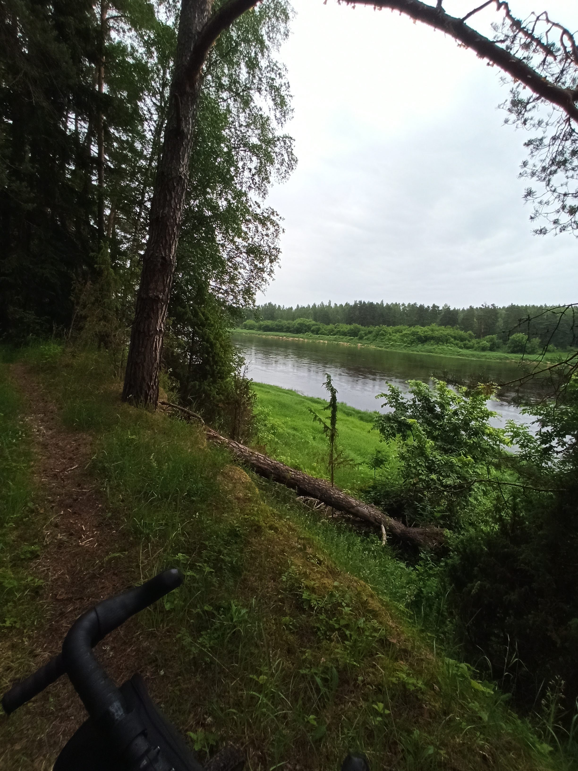 Kārtīgi apaudzis, bet baudāms celiņš veda gar pašu Daugavu, ik pa brīdim ļaujot tajā ieskatīties. Pēc kāda laika arī sasniedzu mežaini un šeit arī sāka parādīties lietus piles, bet par laimi koku gana biezs, lai līdz manīm tik reta tiek. Te pēkšņi taciņa sašaurinās un vēl uz tās neizbraucis zinu, ka mani priekšā gaida kārtīga jautrība. Gar pašu Daugavas krastu gluži kā BMX trase, man liek pamosties, stāvi kalni augšā, tad tik pat stāvi lejā, koka tilts, kuram esmu par gudru un jau laicīgi kāpju nost no riteņa, tad atkal kalni, lejas un kalni līdz iznirstu uz plašāka celiņa.
