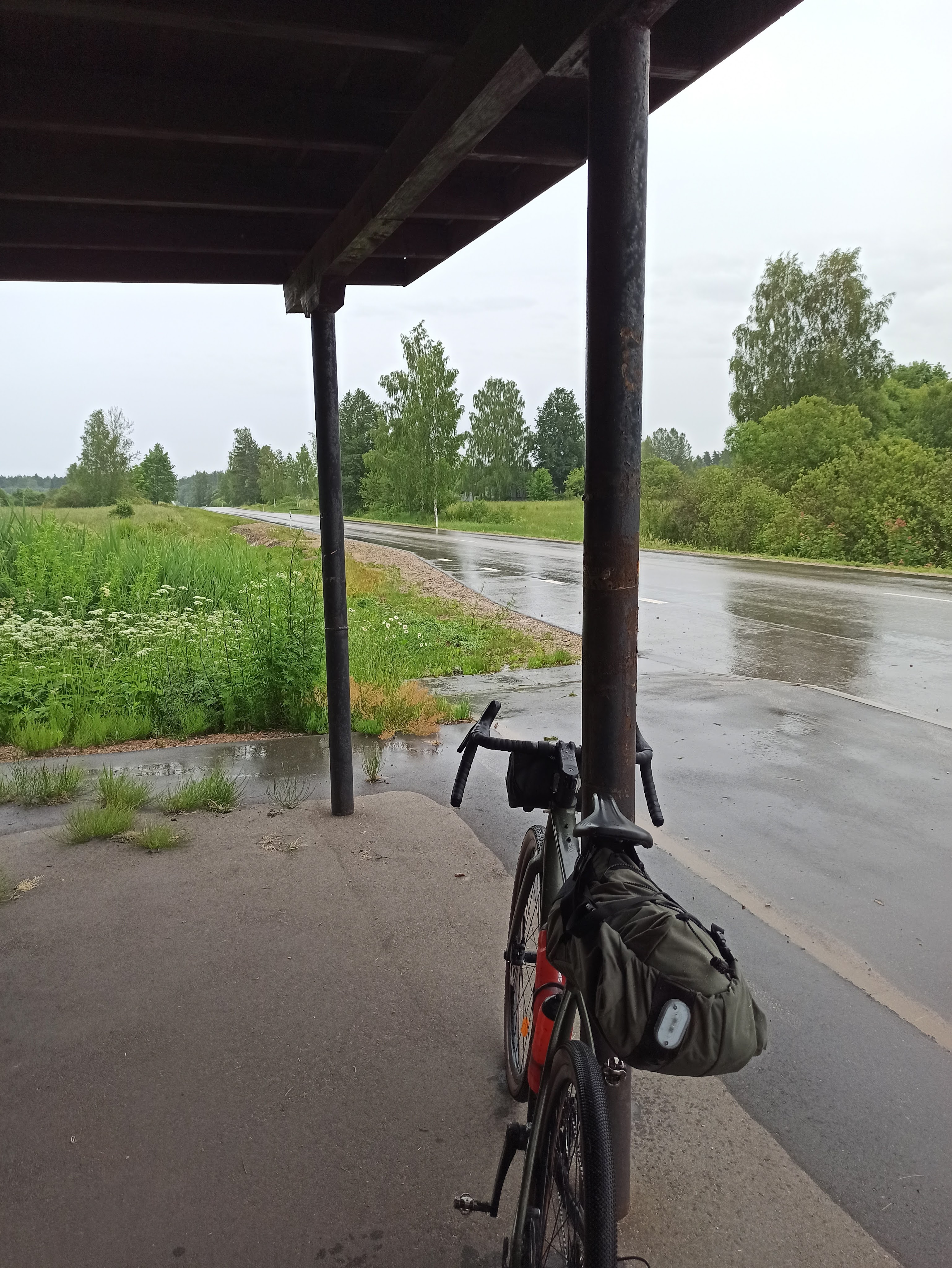 Dagdā bija īsa cerība miera izlīgumam ar lietu, bet lietus par varenu, lai spiestu roku. Sienas raksts liek izteikt: “Darbiņš jāmīl” un minu tik tālāk. Nākošajā pieturā ar jumtiņu veicu atkal maināmo drēbju maiņu. Kvēl-runa pēc kārtējās reizes glābjoties šādā pieturā: “domāju vispār vajadzētu jumtiņu pieturas vēl biežāk, gan ciemos, pilsētās un starp tām, uz lieliem un maziem ceļiem, ar vietējas kopienas izceļošiem elementiem, to novērtētu gan velo, gan sabiedrisko transportu braucēji, gājēji un ceļotāji. Kad tās ir, tas ir labākais patvērums, ja tās ir skaistas, tas liek domāt par vietējo apkaimi 10x augstāk. Ir vienkārši jauki redzēt centienus šķietami parastās lietās.”