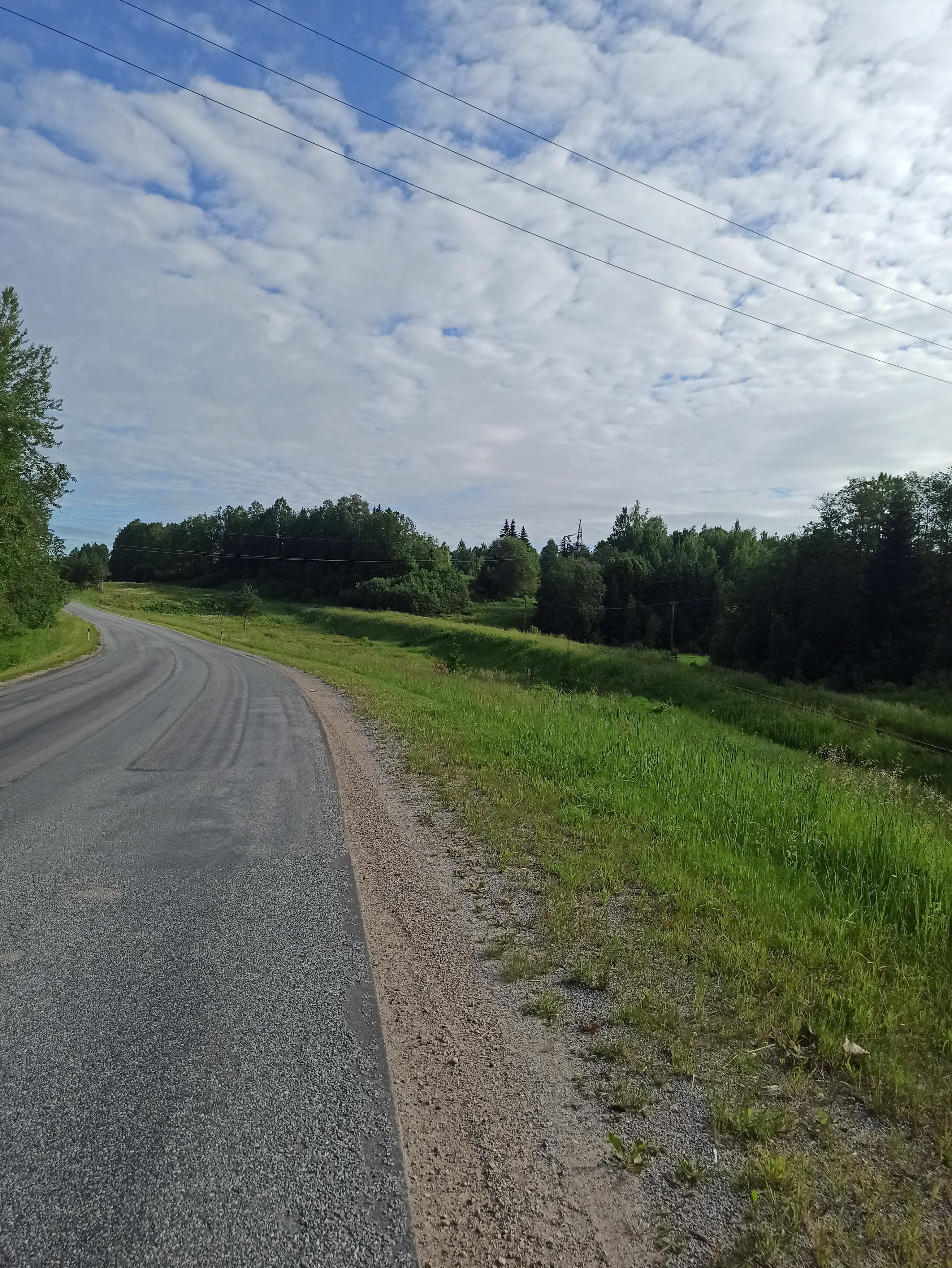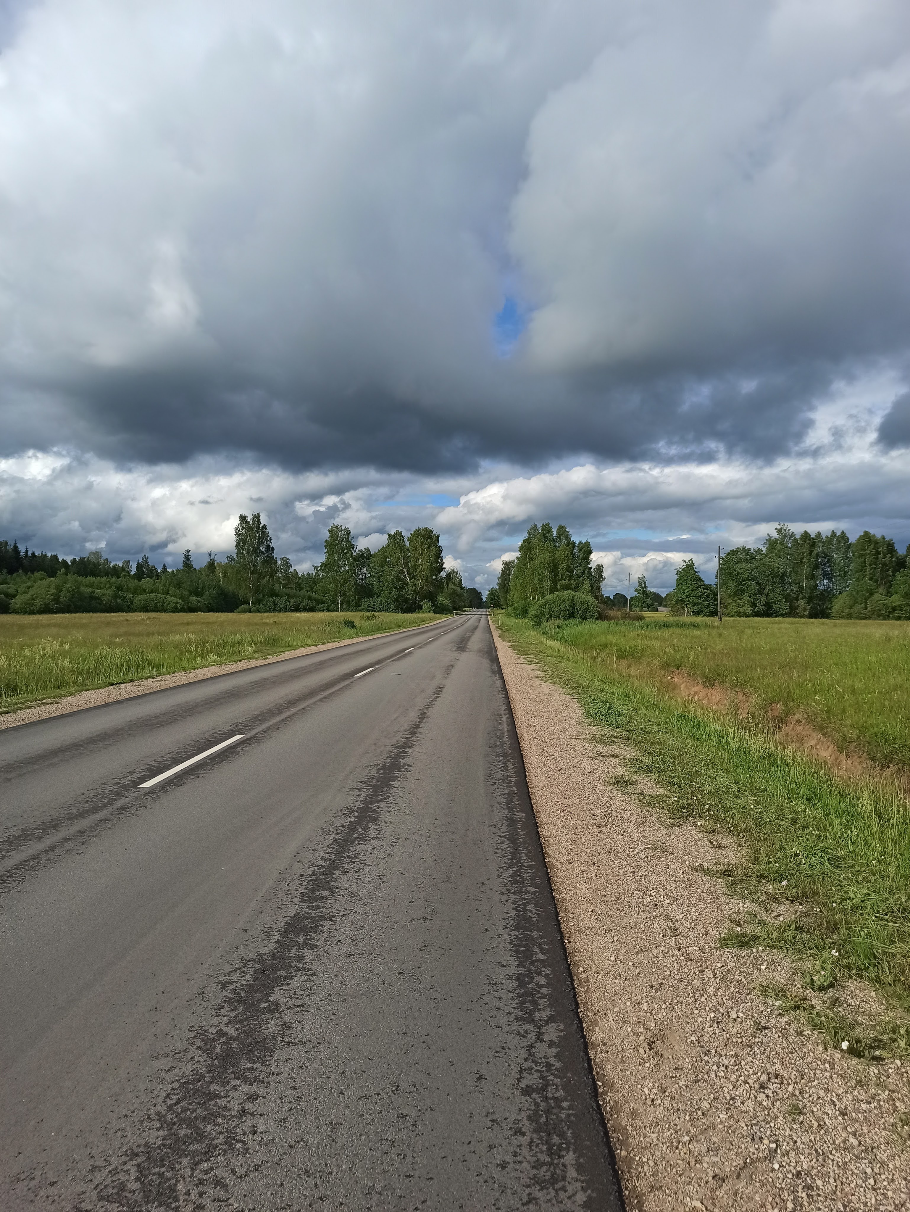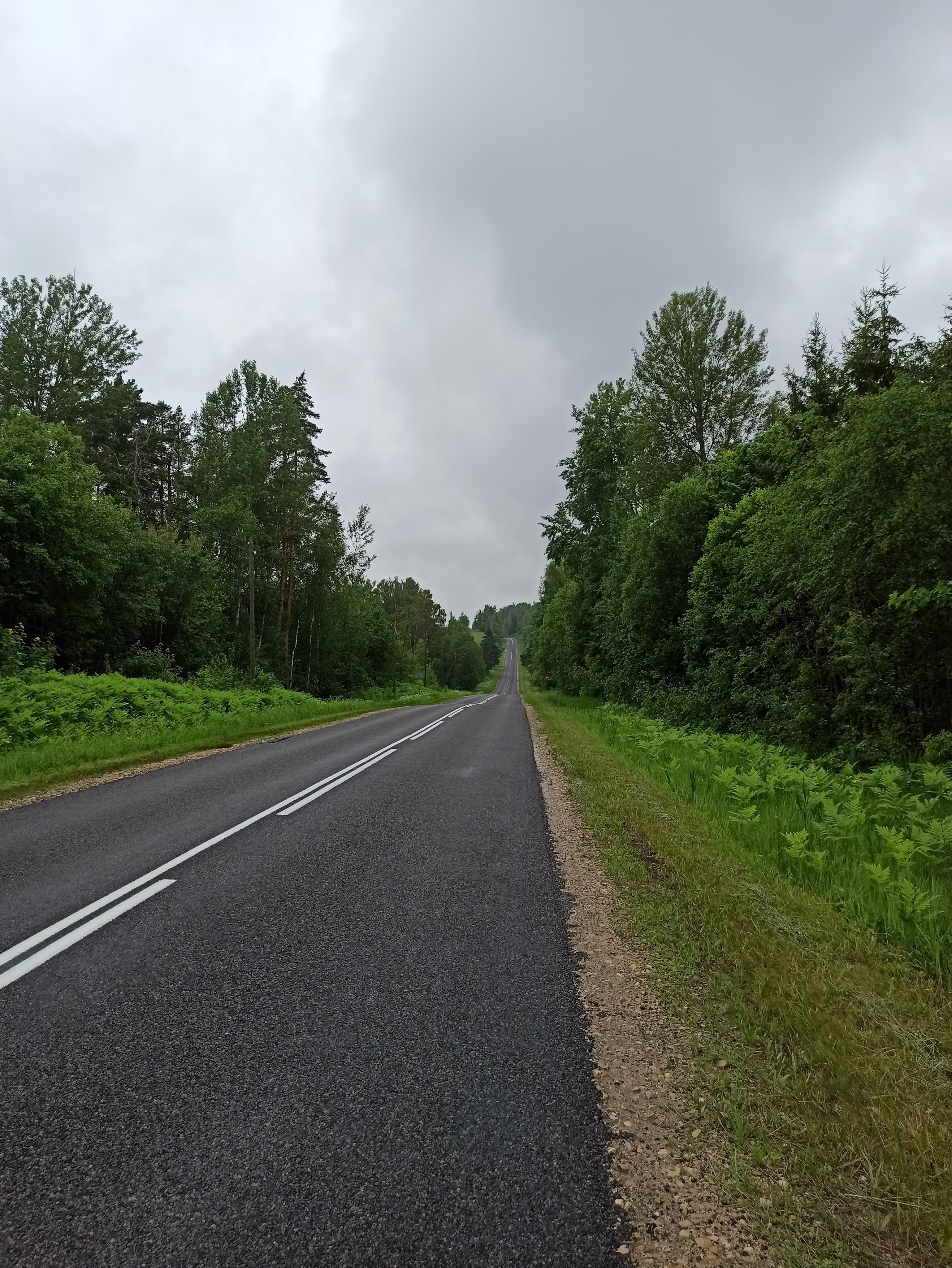 Pilnīgi cita braukšana, kad piktu mākoņu vietā tev pretī zilas debesis un vietējā ezerā saule mirdz. Balviem izminis cauri sēžos uz Gulbenes “šosejas”, kam izmantoju savas grants riepas, lai cīnītos ar asfalta ielāpiem. Dažbrīd plaši lauki, tad staltu koku ielenkumā jaucu galvu šoferiem, rīts mierīgs, bet pavēss, jaciņu vēl nost vilkt neprasās.