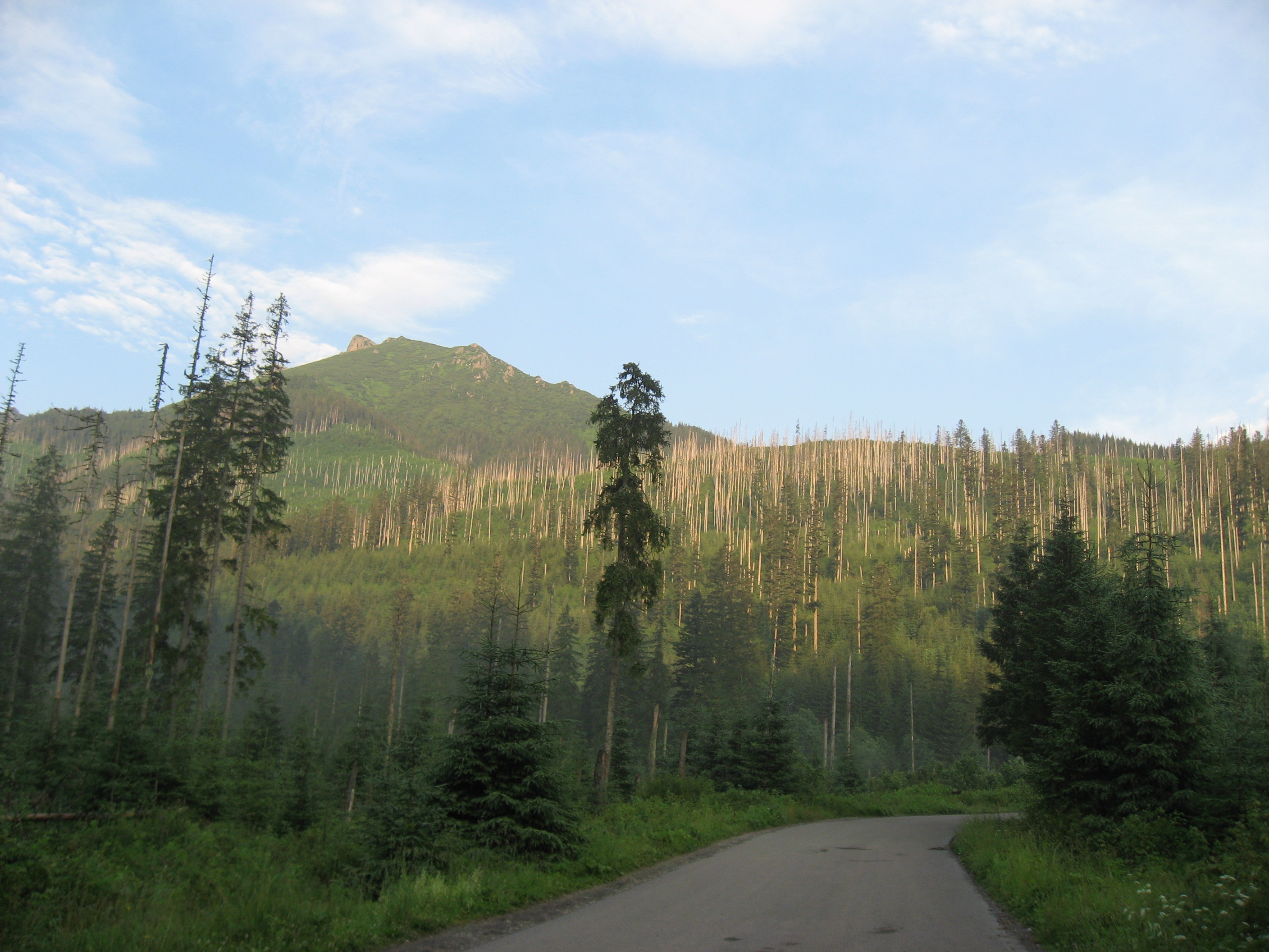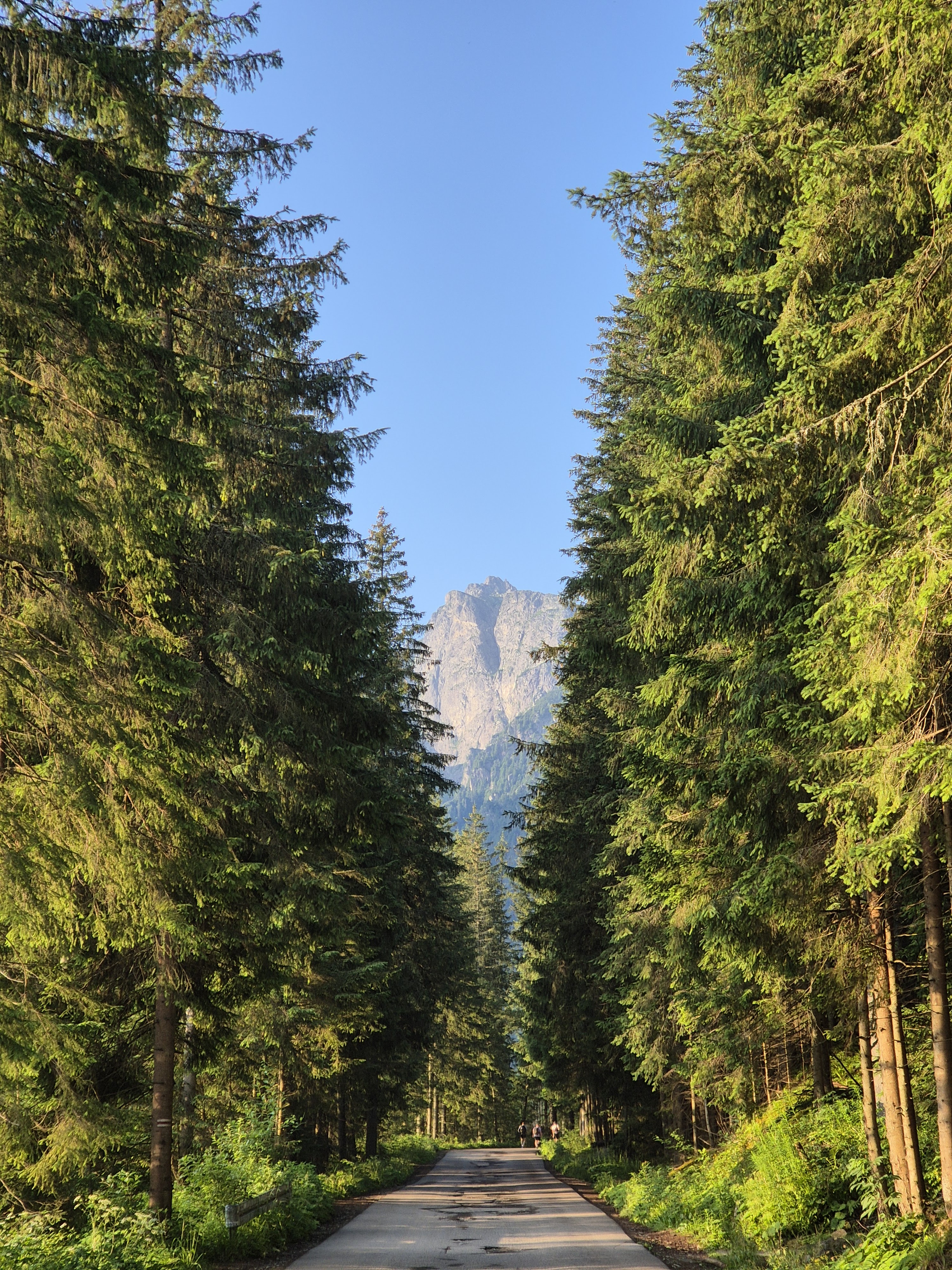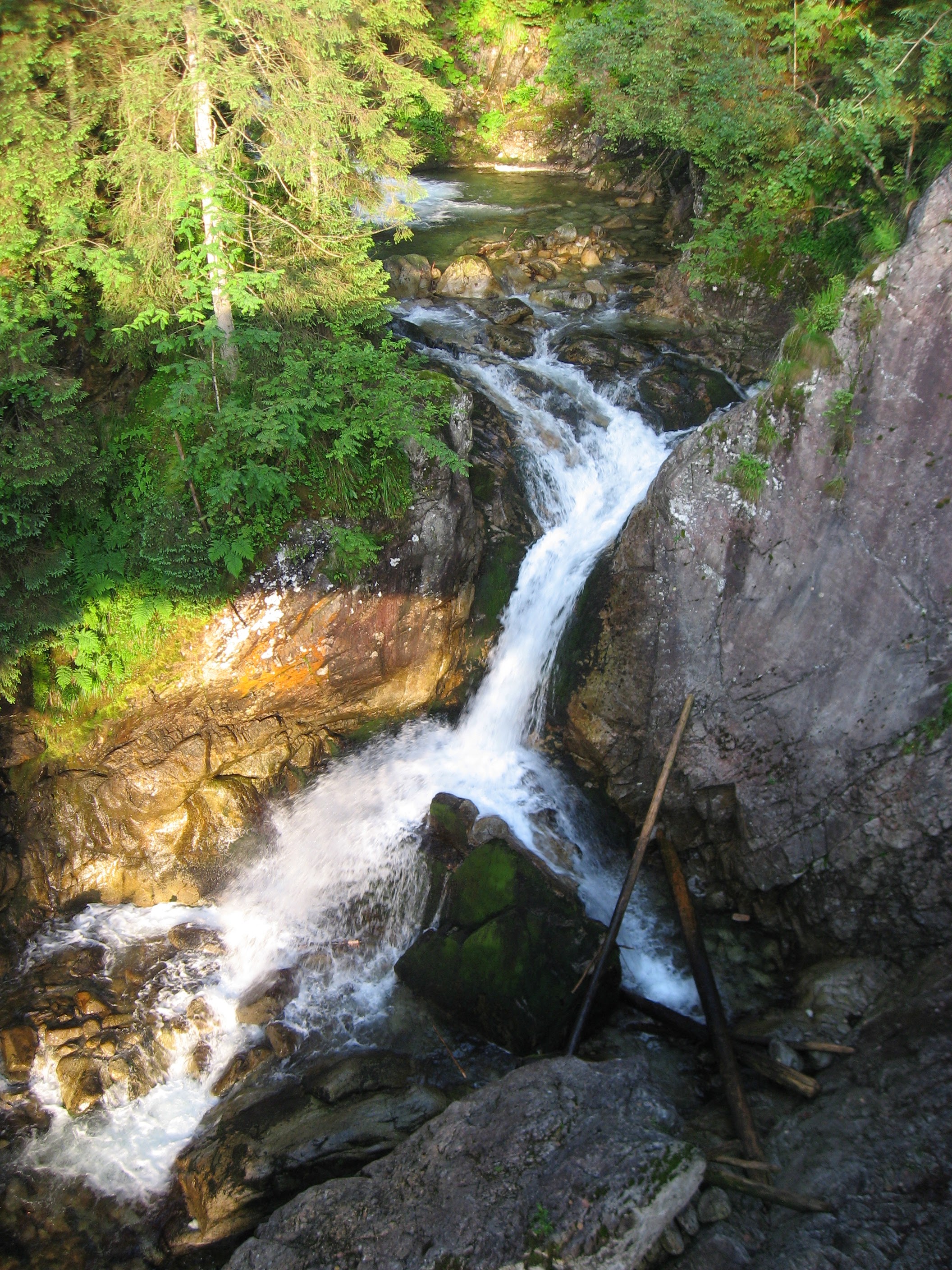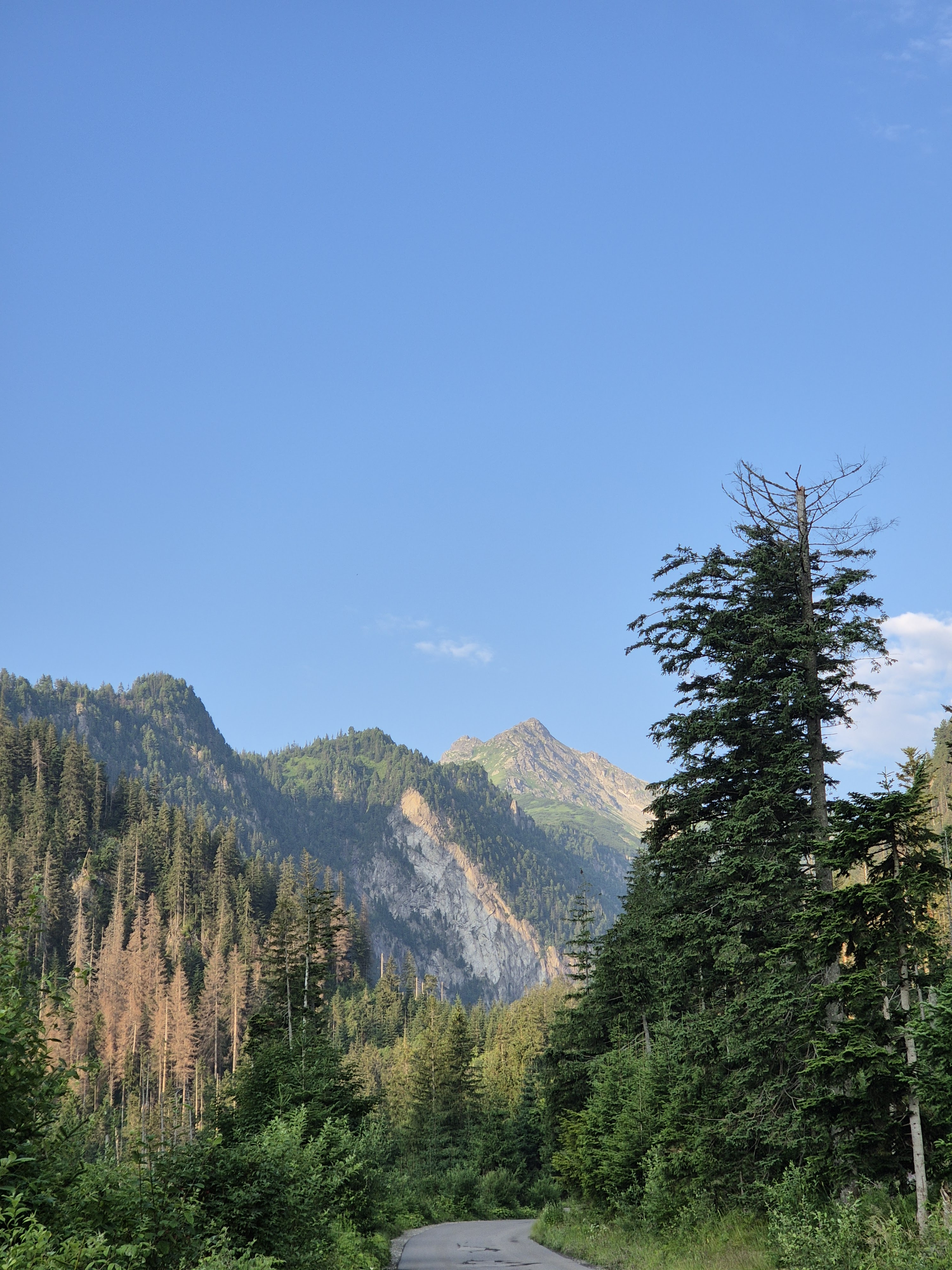 Pagaidām asfalta taciņa, bet stāvums sāk pieņemties strauji, un lai arī sev šo pasniedzu kā skrējienu, aiz katra līkuma pavērās jauns skats ko nevarēju nenobildēt. Kalnu grēda pa kreisi, pa labi, taisni priekšā, tagad starp koku aleju, tad paveras ieleja, ūdenskritums, uz tempu šim skrējienam noteikti nav vērts skatīties. Bet skati tiešām bija iespaidīgi un katrs mirklis likās iespaidīgāks par iepriekšējo, naktī arī bija lijis, un pagaidām vēl skrienot cauri staltu priežu alejai, viss zaļums spīdēja un slavināja savu bagātību.