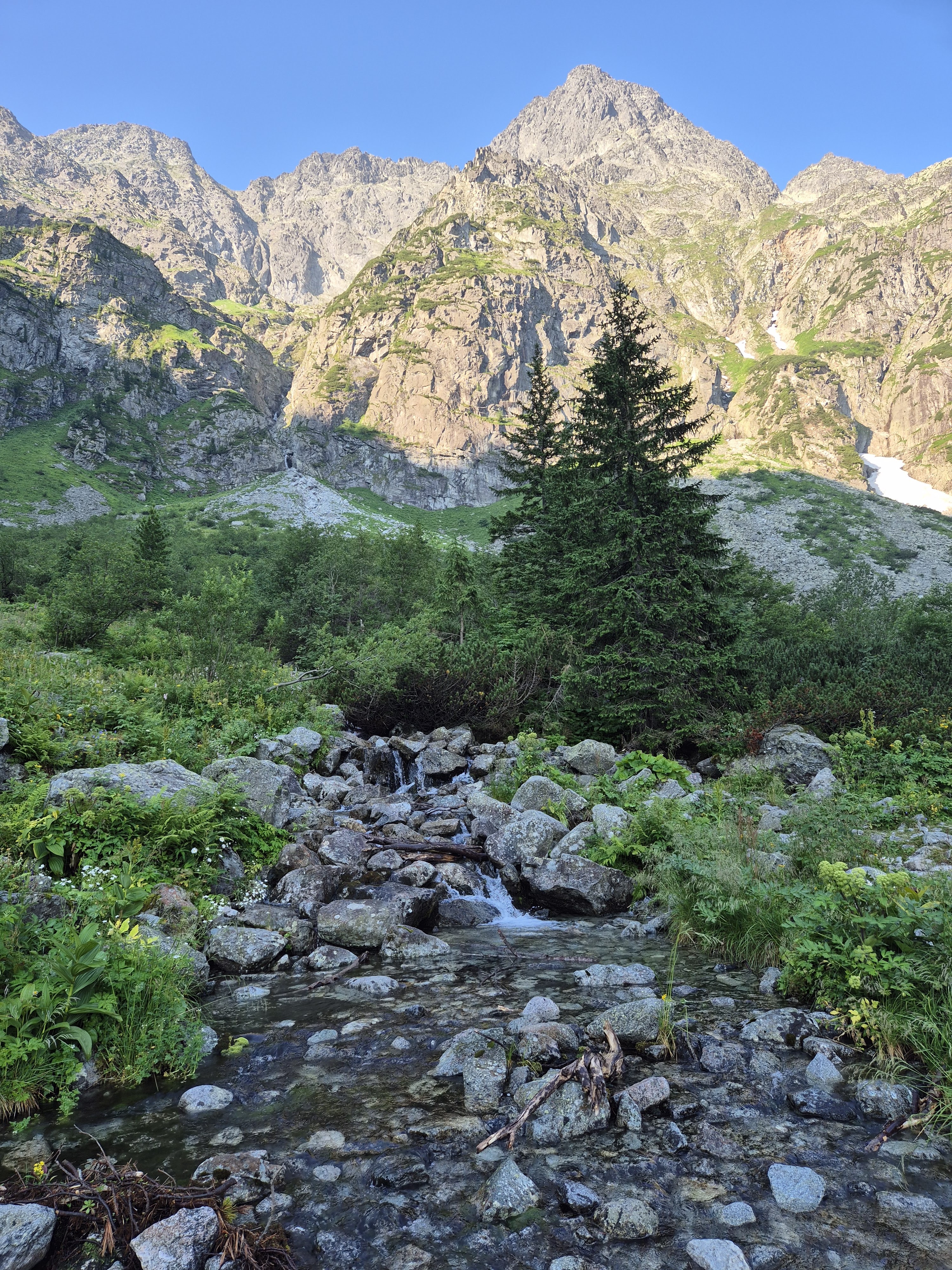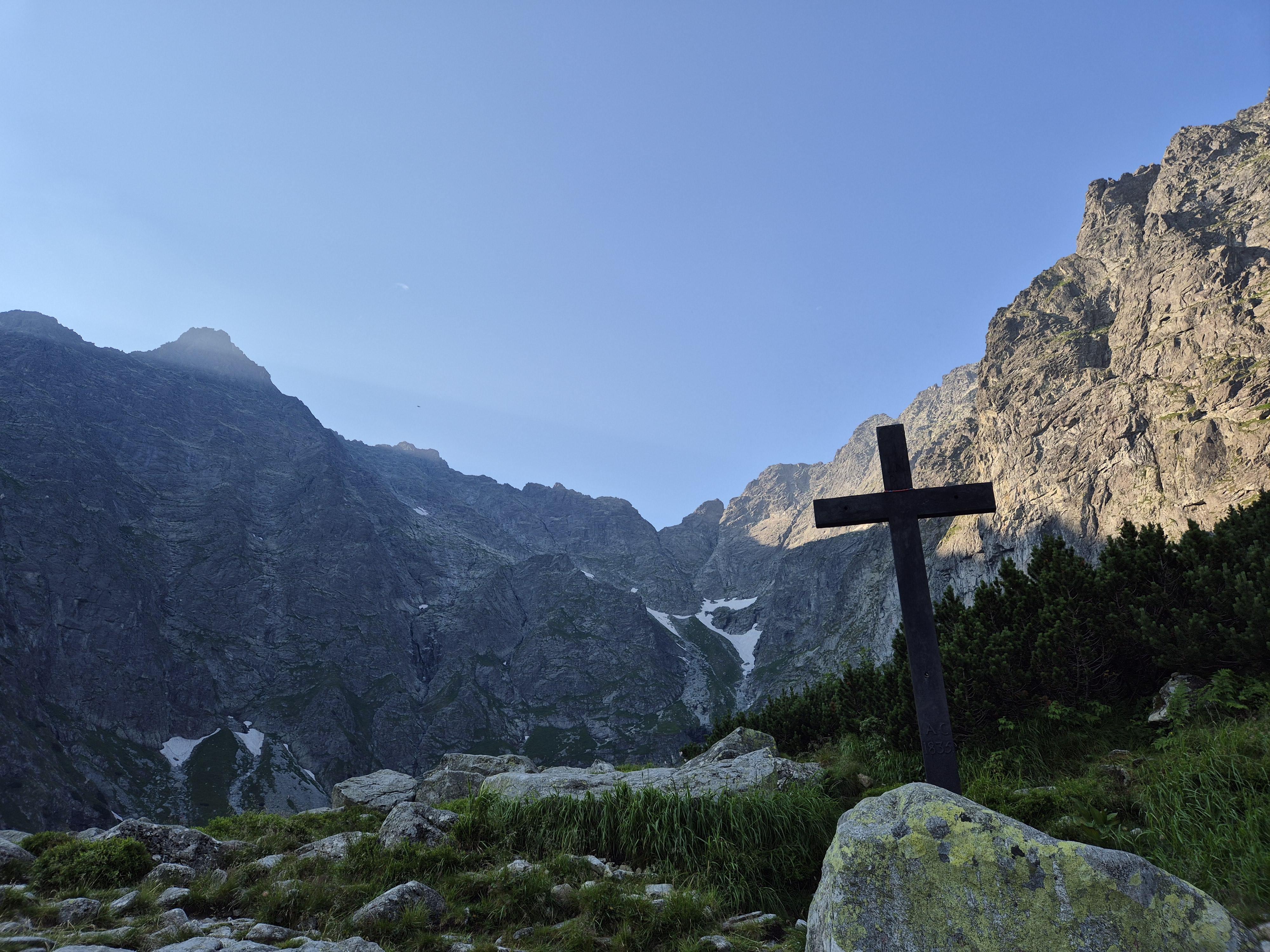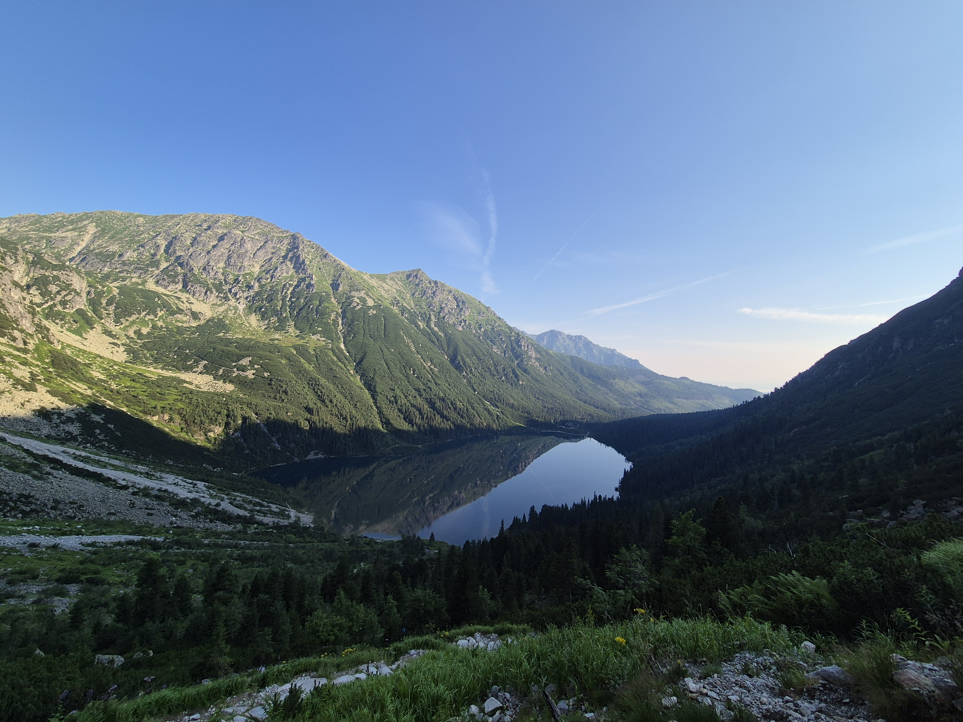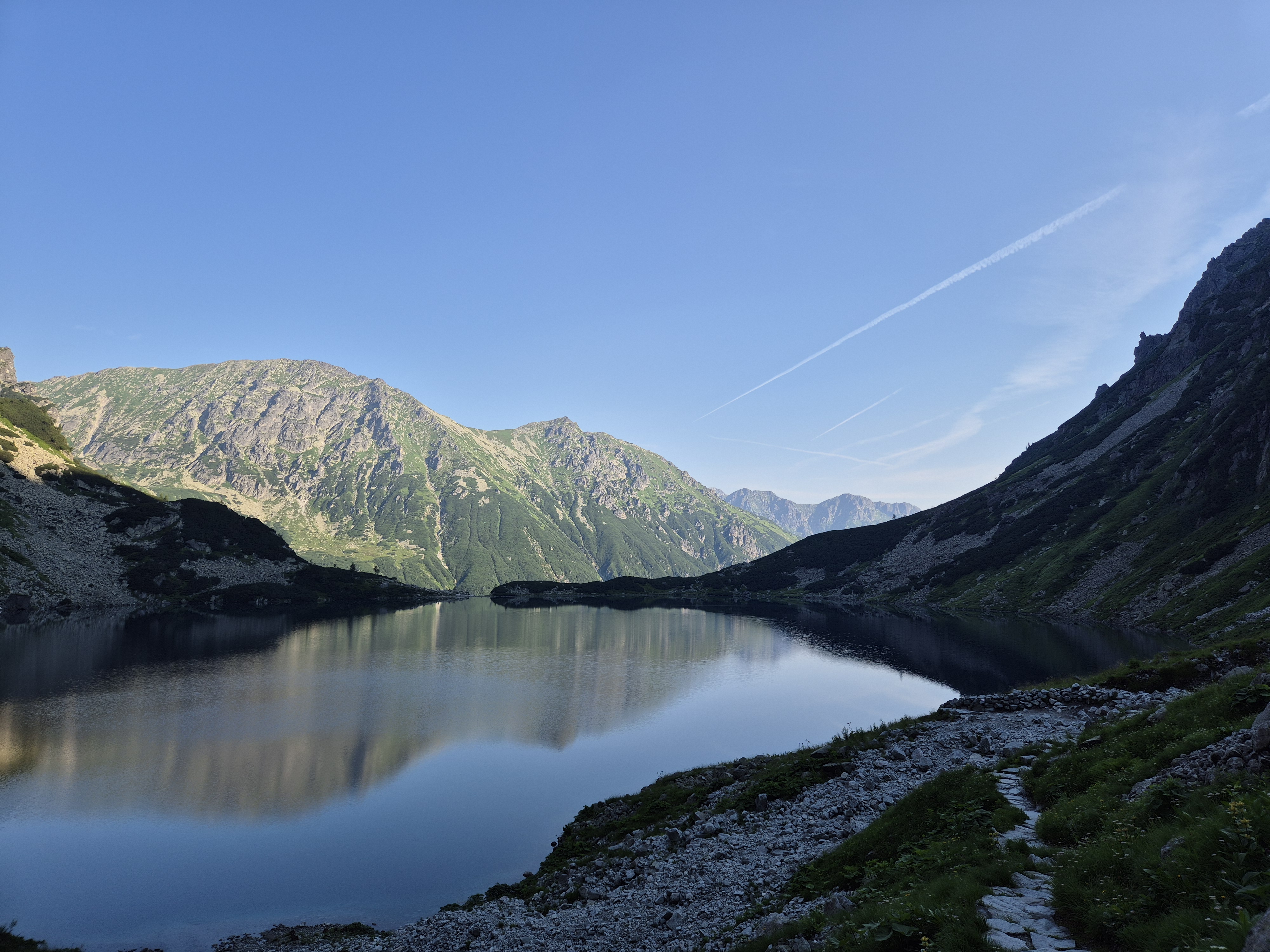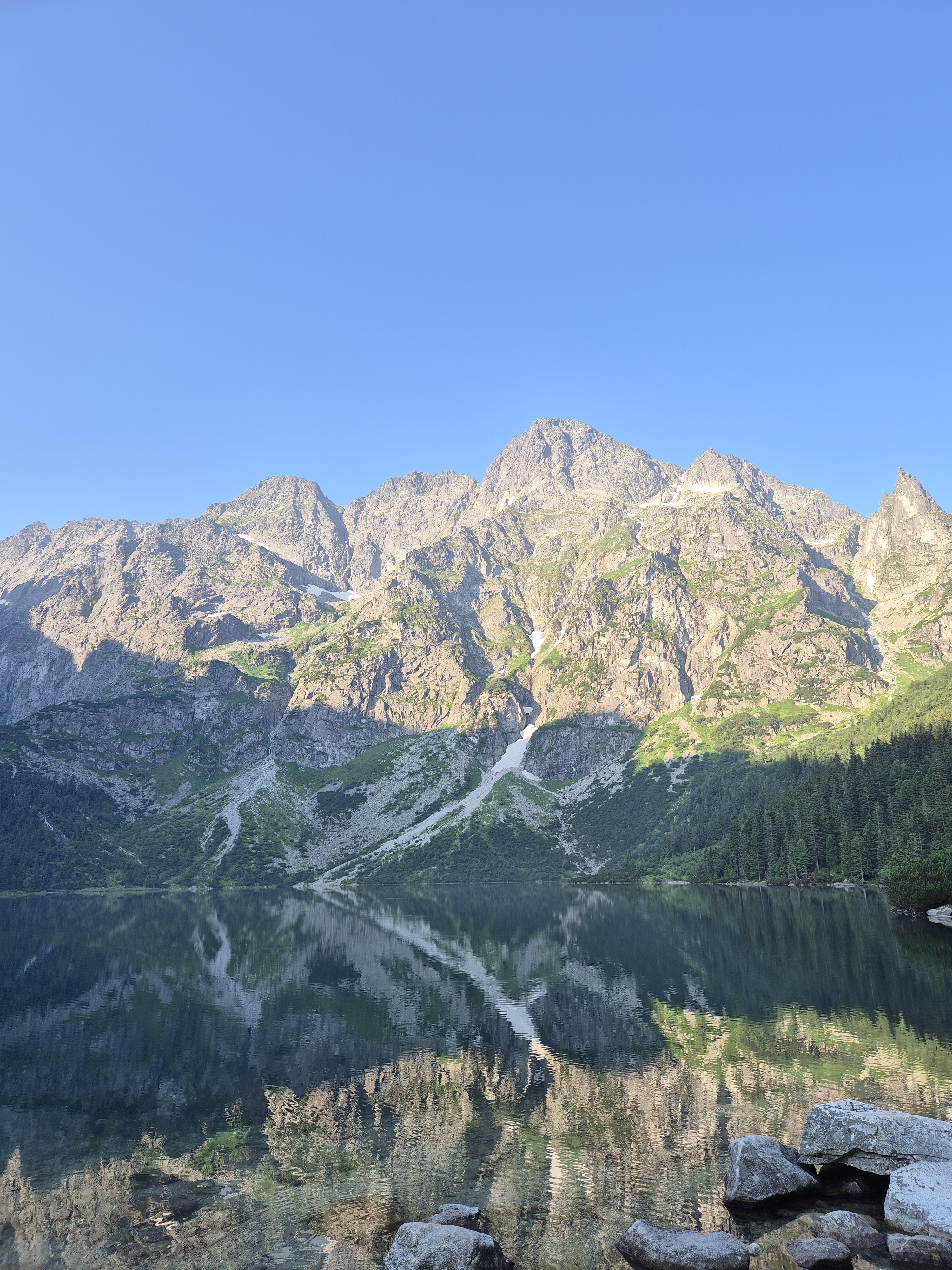 Pēc kāpnēm atkal asfalts un tad atkal kāpnes, kas vēl straujāk nes augšup. Blakus esošās augstienes ar katru soli šķiet tuvākas un liekas jau veļas pāri, ielenkušas, un kā vecie dievi nopēta mūs kā skudriņas. Un tad vēlreiz asfalts un vēl pēdējās trepes, līdz jau nonāku civilizētākā vietiņā, kur veikaliņš gatavojas uzņemt tūristus, bet es tomēr mazliet par agru. Vēl mazliet parikšoju un esmu nonācis pie viena no galvenajiem apskates objektiem “Morskie Oko”, kur pagaidām kluss un bez drūzmas varu uzņemt bildes un priecāties par to kā akmeņotās kalnu grēdas gozējas ezera spogulī, un tā kā šī diena pagaidām bez vēja, tad tiešām grezns spogulis.