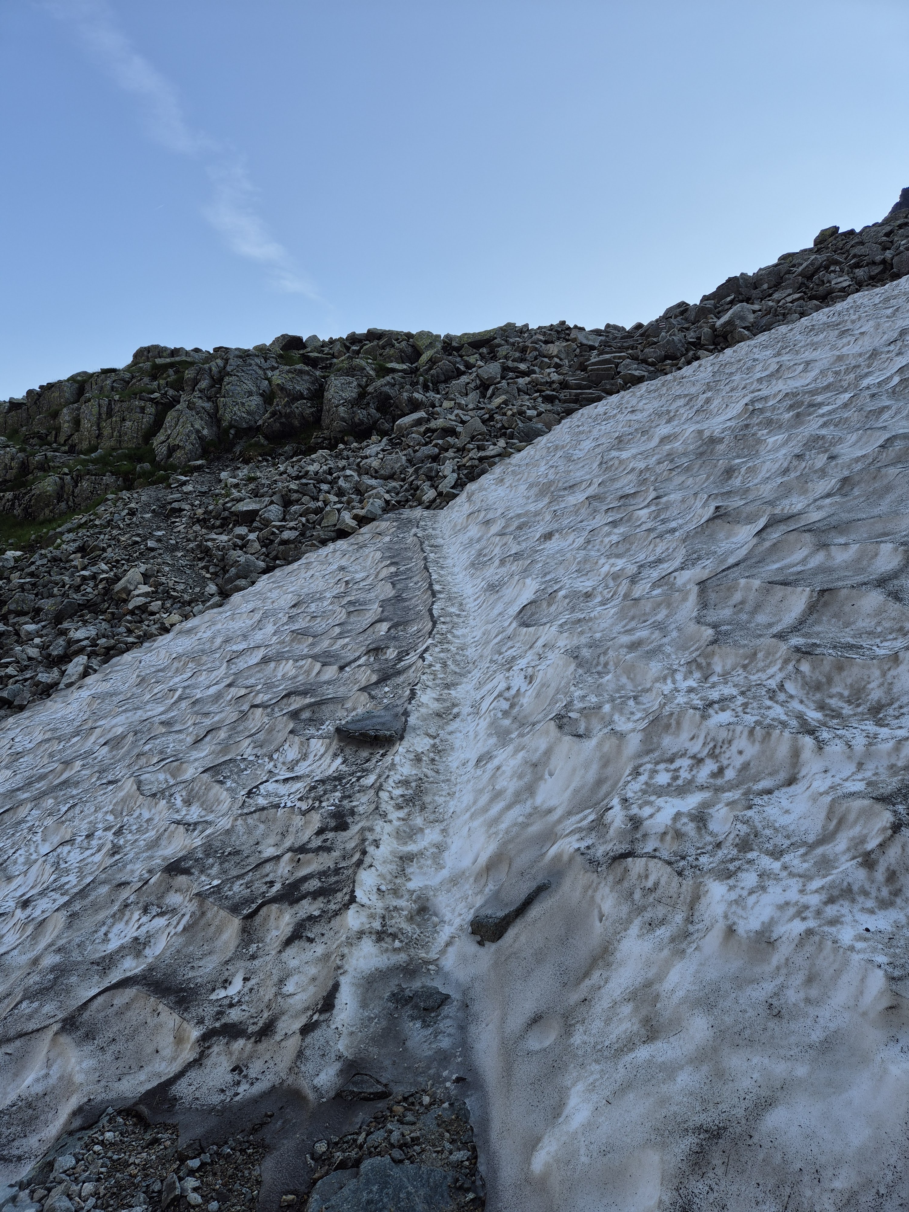 Tā ļoti uzmanīgi lienu, rāpoju un slīdu, cik tuvu sienai vien iespējams. Beidzot sāk parādīties plakanākas sekcijas, varu uzņemt ātrumu un vairs neesmu tas kurš bremzē, atkal tikuši pār sniega sienai, jau trepes ir trepes un varu uzņemt ātrumu.