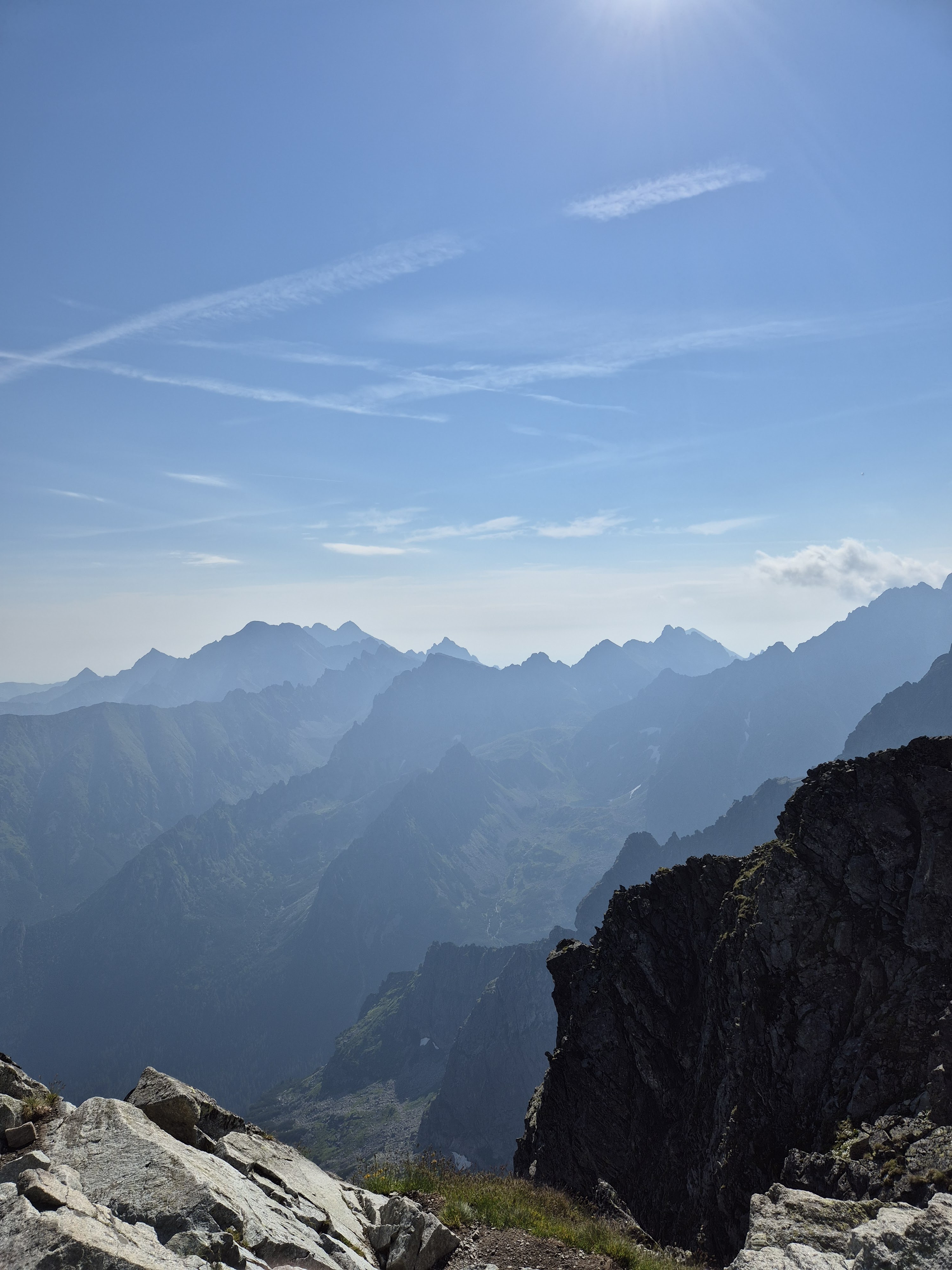 Siena pēc sienas stāvāka, paspēju pat rāpot, izmantoju visas savas zināšanas no bolderinga nodarbībām, sāku jau domāt, ka šis nebūtu ieteicams kāpiens nedz otrajā, nedz trešajā reizē. Un te esmu saniedzis kādu virsotnīti, kur kāds polis ar izmisumu balsī joko par helikopteriem. Šī gan ir tikai virsotne pirms īstās virsotnes, lai tiktu uz pašu Rysi ir jāšķērso šaura kore ar ļoti stāvu nogāzi, kur nesanāk neredzēt, kas notiek lejā, un vēl pie tam reizē abās pusēs. Zobus sakodis eju un esmu jau gandrīz galā/virsotnē. Mazliet jāpaložņā un viss! Skats pāri visam, diezgan burtiski, cilvēki priecājas un bildējas. Atrodu gana stabilu vietu, kur piesēst un beidzot apskatu, kas man apkārt paveras.