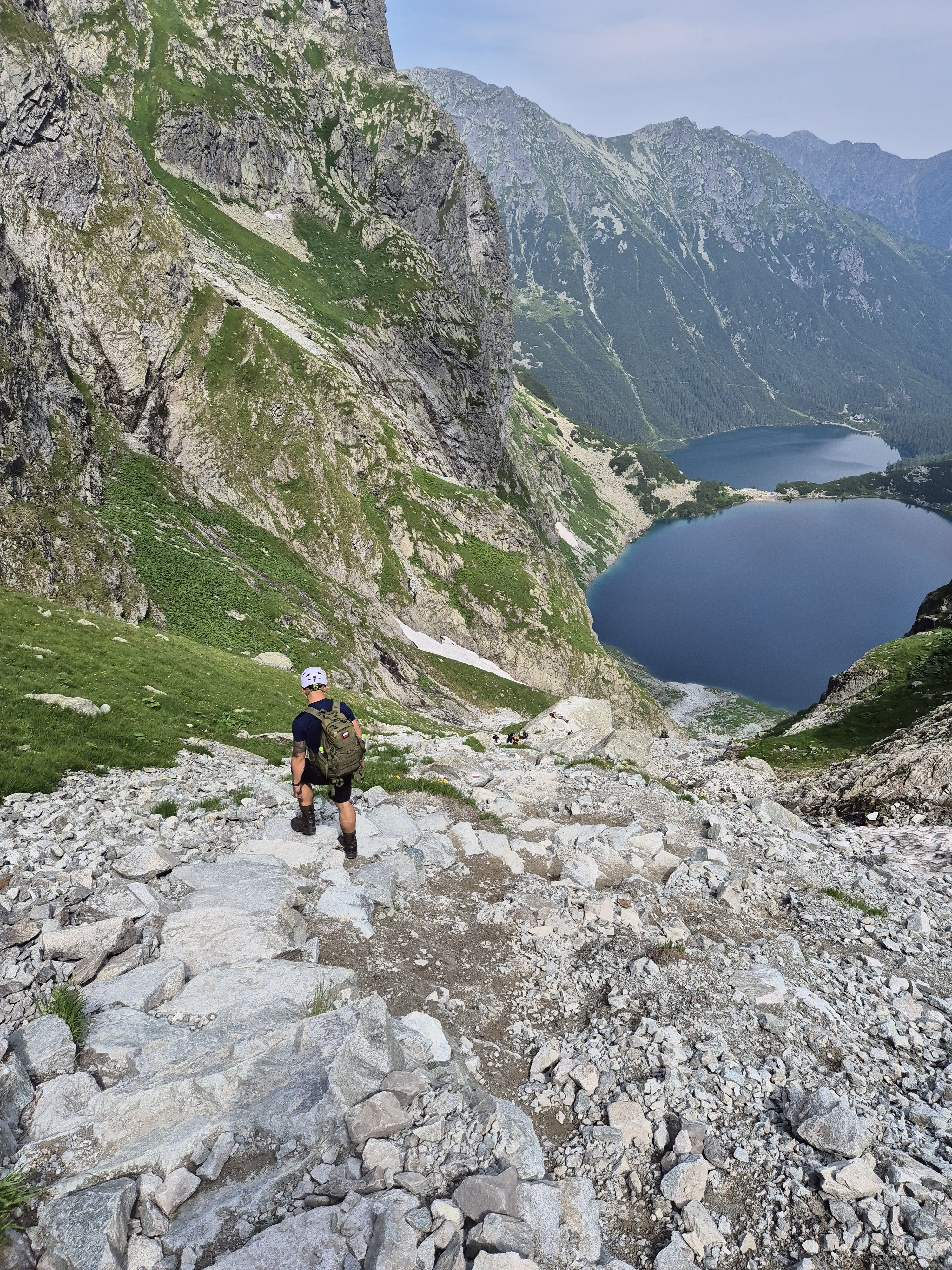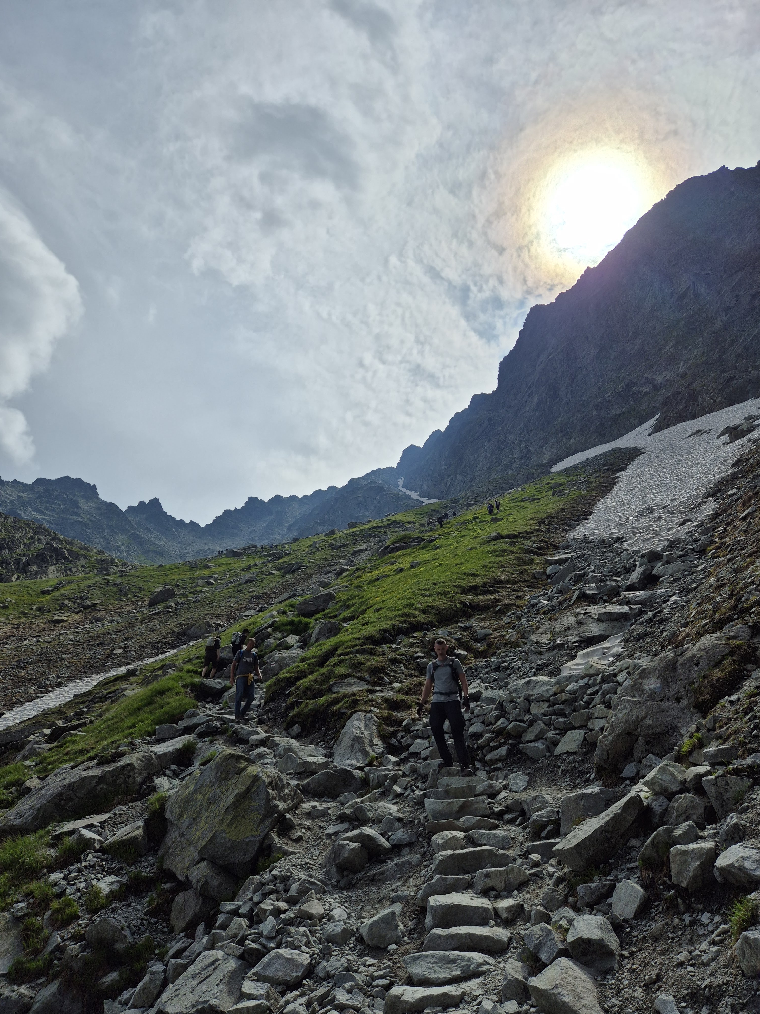 Lejā ejot jau cilvēku skaits ir krietni audzis, vēl no augšas redzu cilvēkus kā pie viena tā otra ezera. Pamanu arī telefonā ziņojumu par tuvojošos vētru un redzu kā mākonis peld virs tikko sasniegtās virsotnes, labi ka tik ātri cēlāmies.